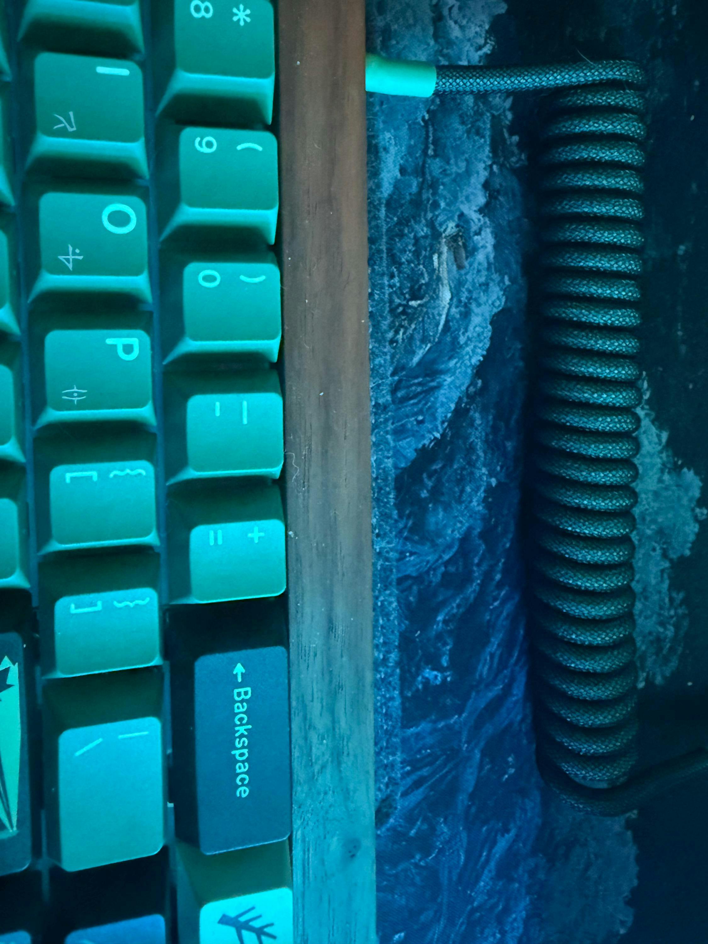 This teal keyboard cable model takes inspiration from GMK Terror Below keycaps. It's also a great match for any teal keycaps and keyboards. Accompanied by a green croc cable protector!